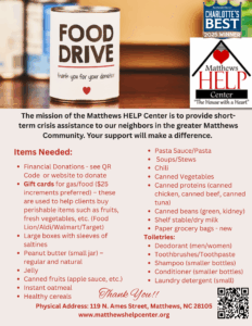 The mission of Matthews HELP Center is to provide short-term crisis assistance to our neighbors in the Greater Matthews community.