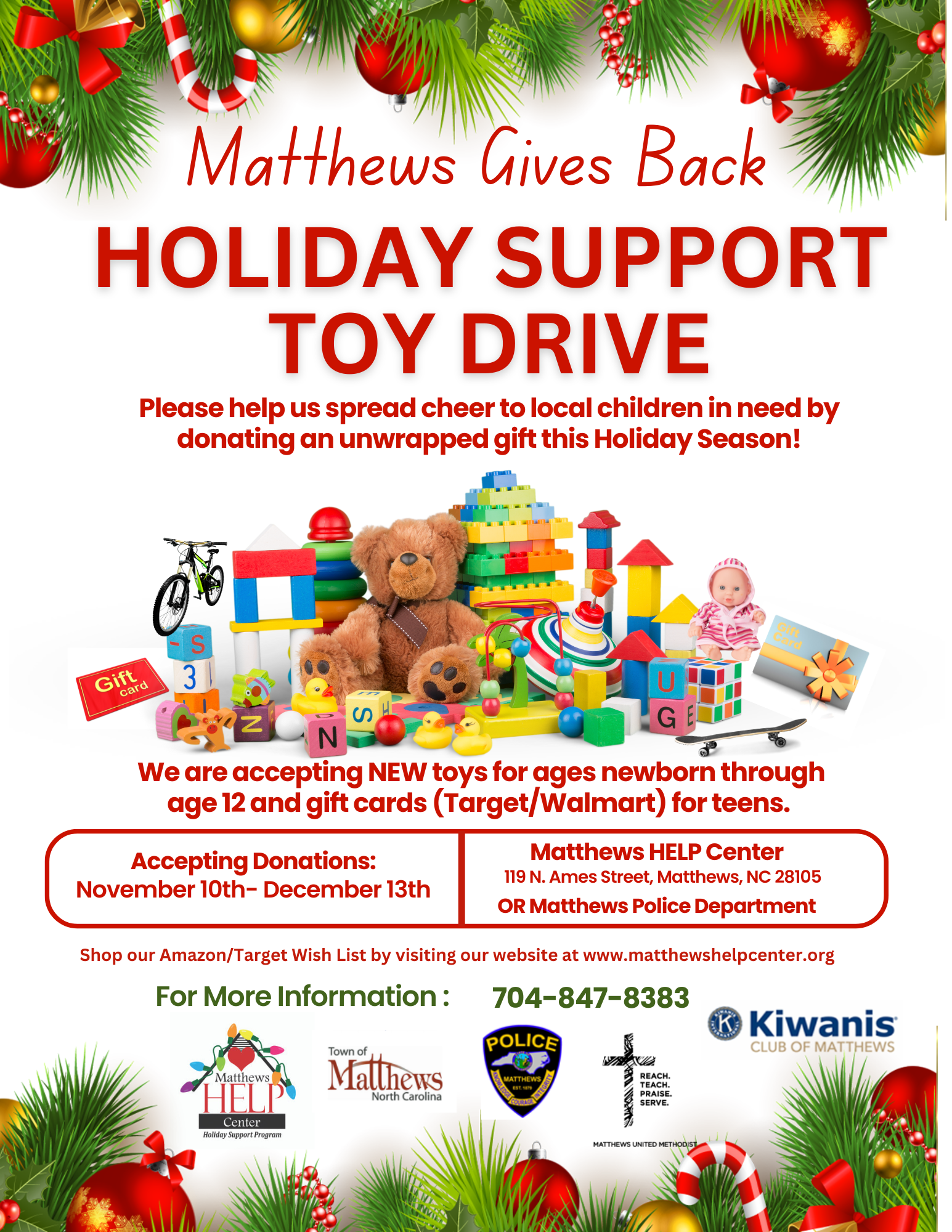 - Holiday Support Toy and Gift Card Drive (November 10th through December 13th) - we are seeking new, unwrapped toys for newborn through age 12 and gift cards (Target/Walmart) for teens 13+ (increments of $25, please). If you are interested in having a drive, please reach out to Nick Saunders, Development Coordinator at 704-847-8383 x 232 for more information or development@matthewshelpcenter.org. Thank you so much.